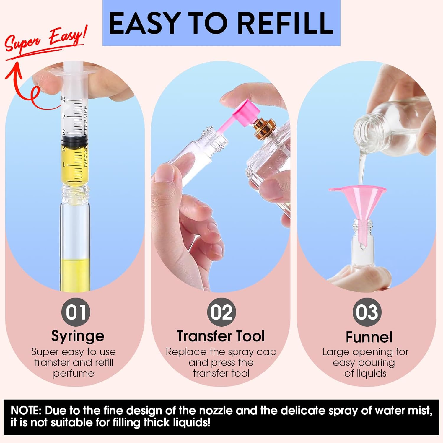 - 【Package Included】- 6pcs refillable perfume bottles, 2x funnel, 1x syringe, 3x transfer tools and 1x storage bag , enough quantity to satisfy your different needs, also you can share some with friends or family.