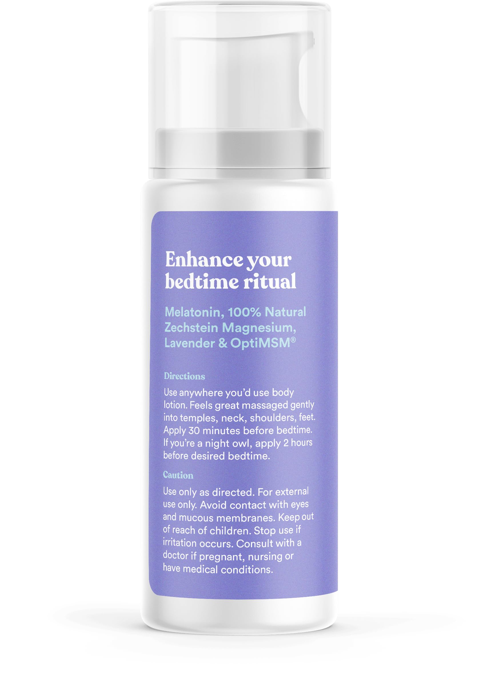 Details: Lull your body into a restful and calming night with the natural power of pure melatonin and magnesium lotion with lavender aromatherapy. OptiMSM is our secret ingredient that helps aid in magnesium absorption, renews skin, and supports healthy joints, muscles, hair and nails. These powerful ingredients, combined with the skin-loving and moisturizing touches of lavender and sweet almond oil along with luxurious shea butter, transform your ordinary bedtime routine into a beauty ritual of pure bliss. Gentle sweet almond oil, calming lavender, and rich shea butter gently moisturize and soften skin, leaving you smooth and irresistibly touchable with a light, fresh, and clean scent. Wake up each morning feeling well rested, with skin that is softer and gently scented. With natural oils and the highest-quality magnesium along with the proven relaxation powers of melatonin, this calming aromatherapy lotion can help soothe and calm you before bedtime. The fast-absorbing formula works quickly to moisturize and soften skin without feeling greasy or oily, giving your skin a treat that you’ll look forward to night after night. Let your skin drink in the natural healing power of sweet almond oil, shea butter, and lavender as they work to moisturize under the surface.