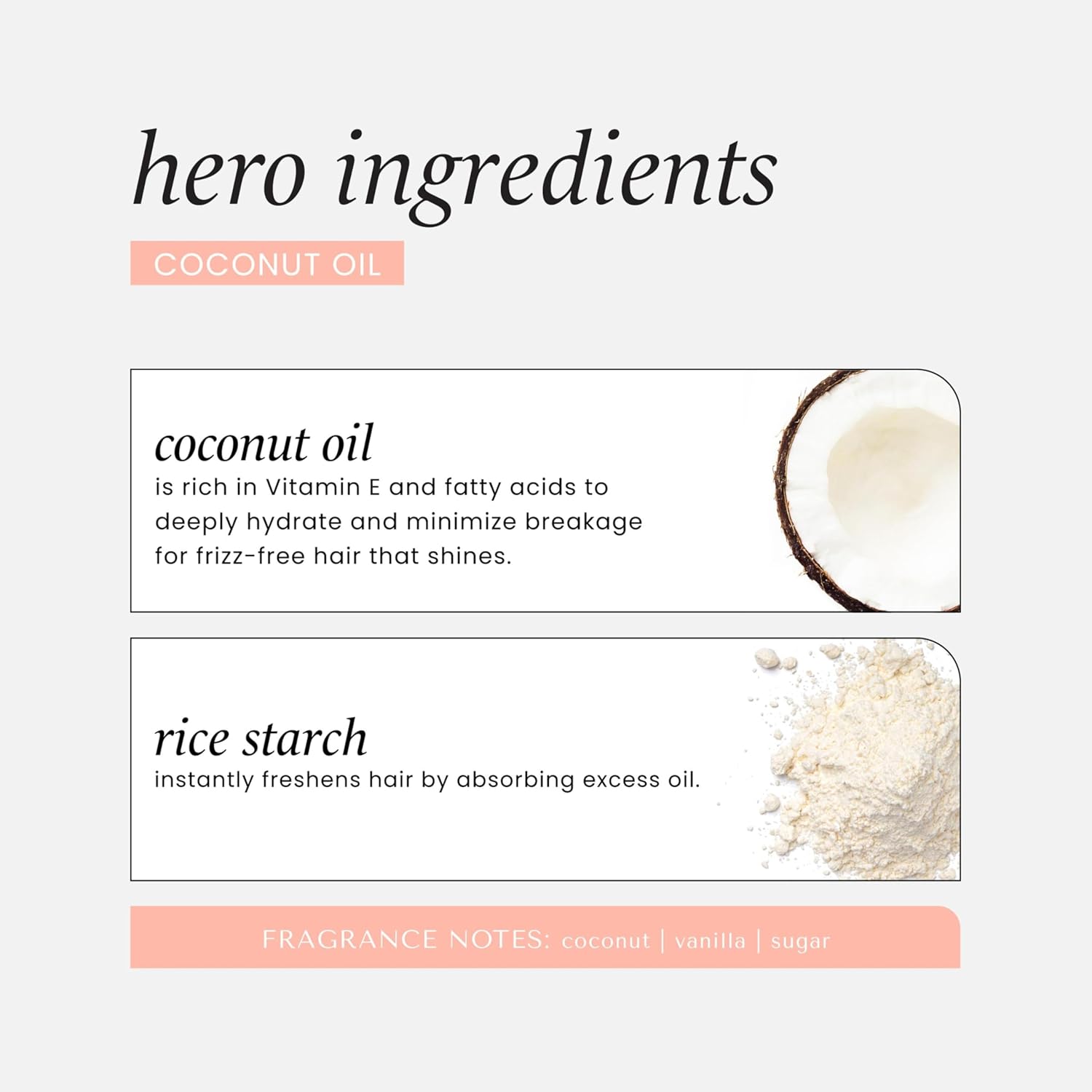 - Coconut Oil & Rice Starch | Infused with coconut oil to deeply hydrate and minimize breakage, while rice starch absorbs excess oil, leaving hair fresh and static-free without any gritty residue