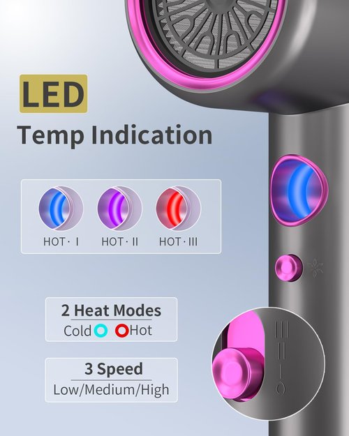- ✅【LED Display Light with Adjustable Wind Speeds】Our hair dryer has 3 different LED lights built in, you can turn the LEDs into different colors by switching the heat button,enjoy blow-drying your hair in comfort.
