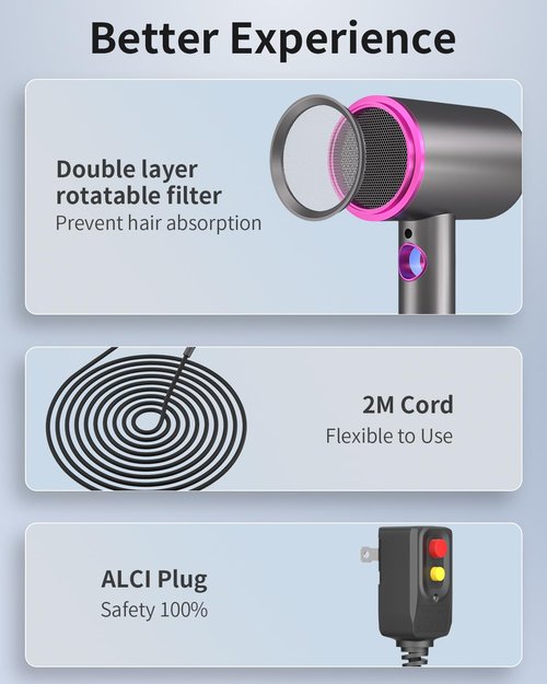 - ✅【200 Million Negative Ions & No frizz】The ionic hair dryer produces 200 million negative ions, which can balance the static electricity, lock the moisture in the hair, and makeyour hair softer, silkier and shiny.
