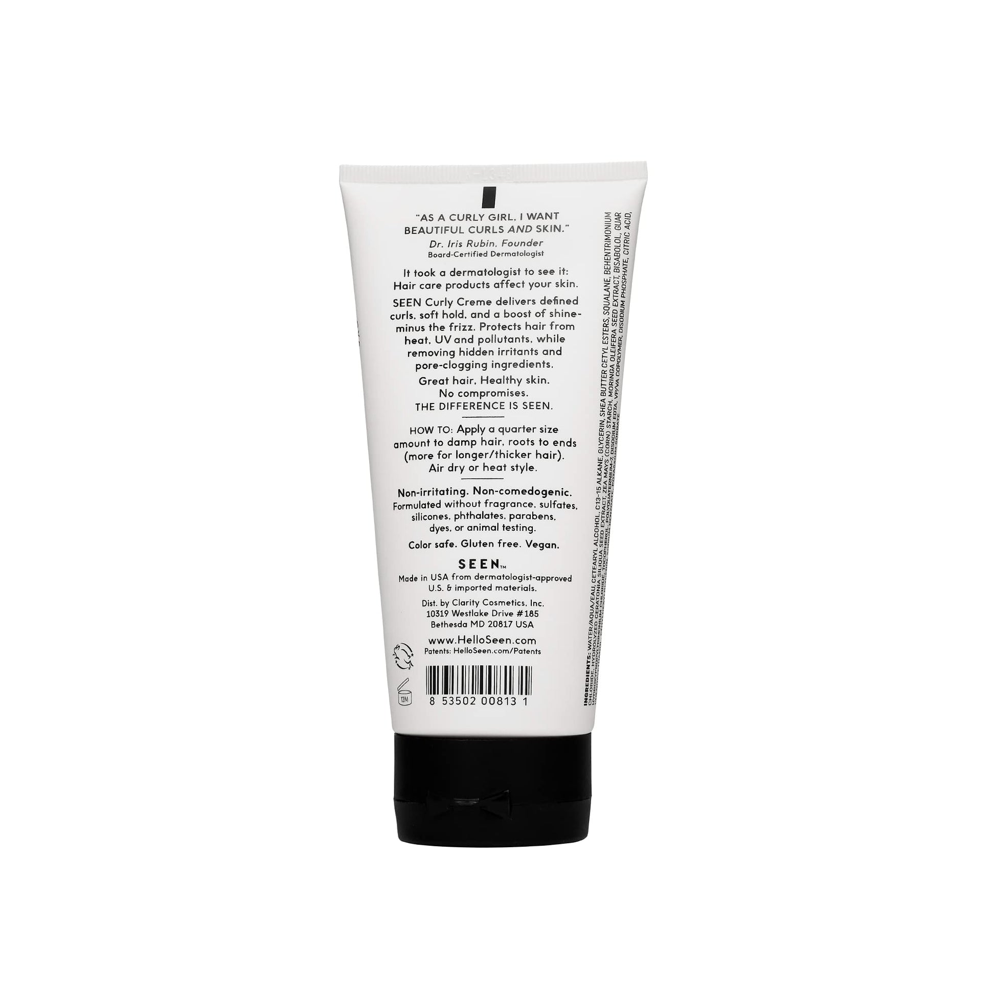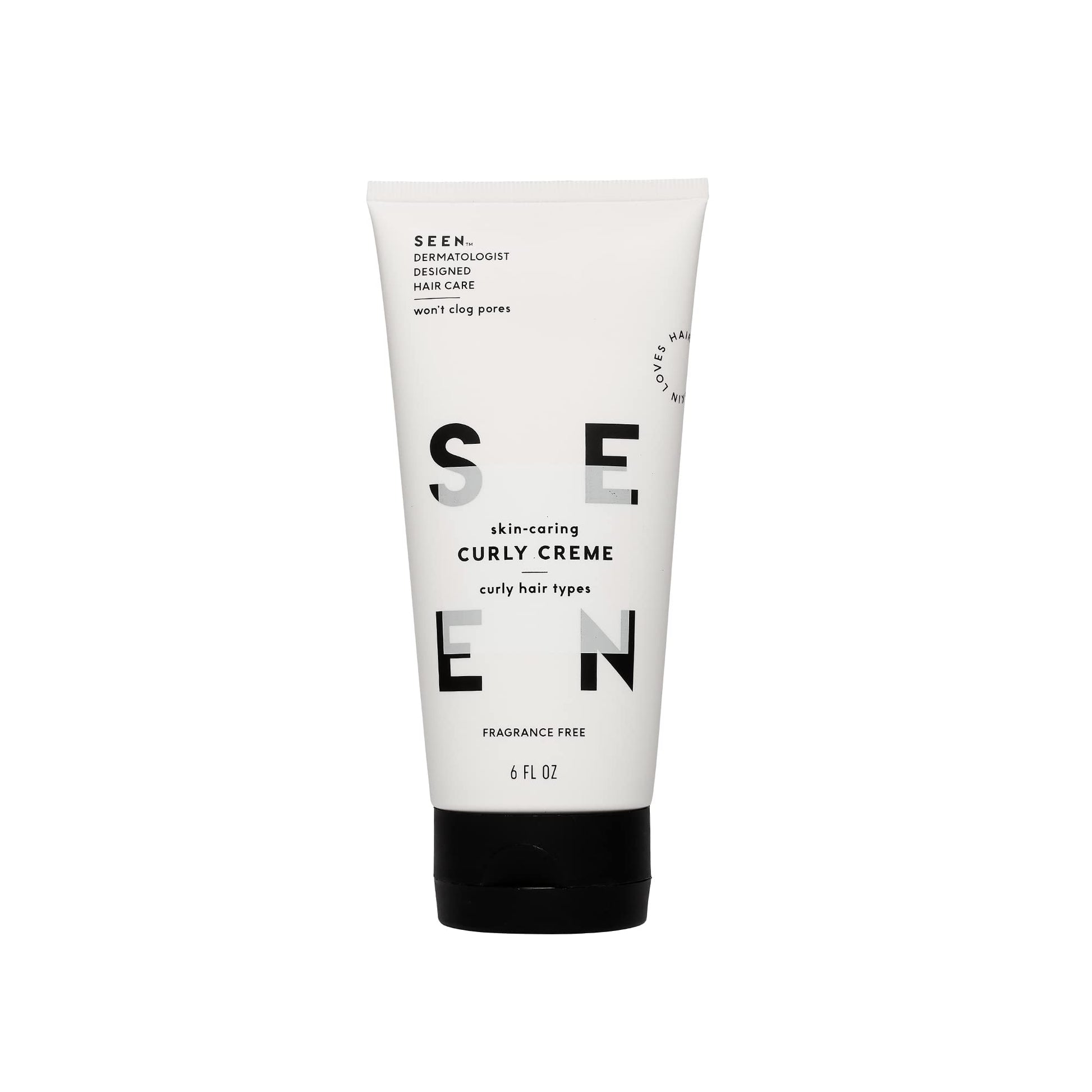 - WHAT IT IS: A dermatologist-developed, fragrance free, vegan, non-comedogenic fragrance free curly cream that helps you make the most of your curls while avoiding a “crunchy” feel. Fragrance free SEEN Curly Creme is sulfate free and is designed to reduce frizz, add shine, and provide hair with protection against UV rays, pollution, breakage* as well as heat up to 450º Fahrenheit. Safe for sensitive skin. Safe for acne prone skin. Safe for eczema prone skin.