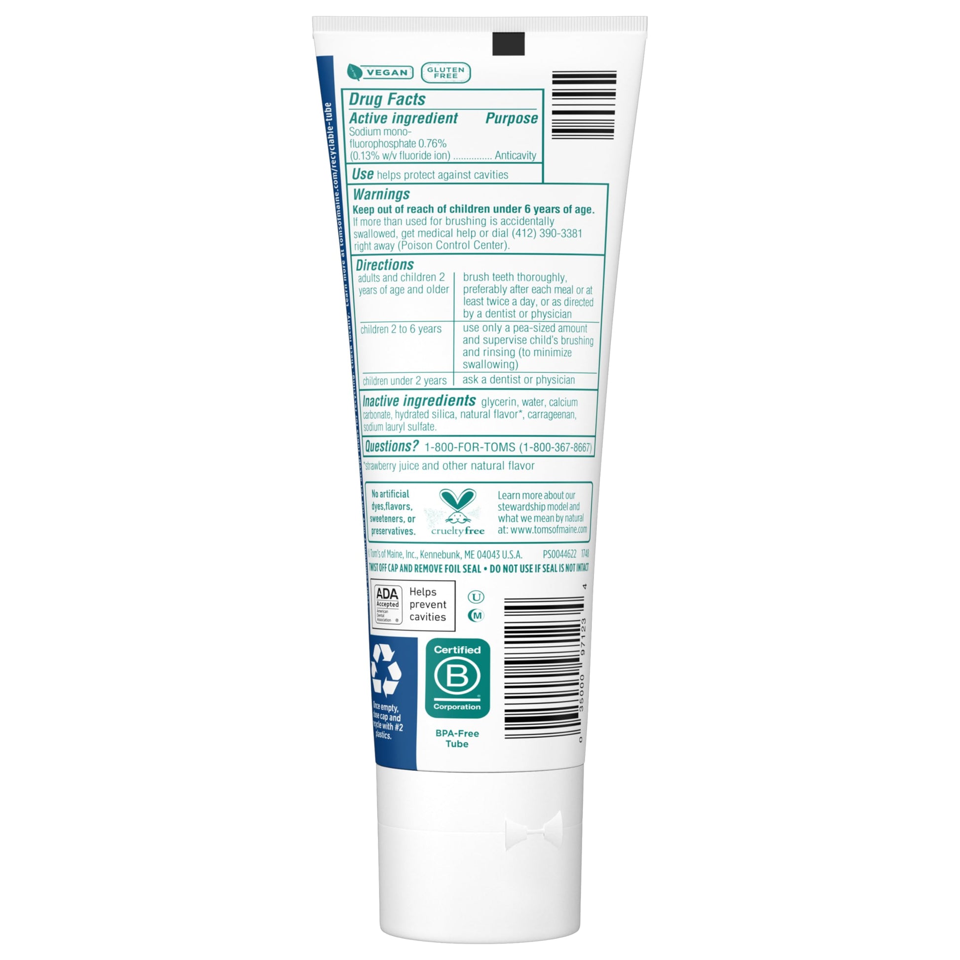 Details: #1 Kid's Natural Toothpaste Brand, (Based in part on data reported by Nielsen through its Connect Service for the Toothpaste Category for the 52 week period ending 8/27/22, for the AOC market. Copyright 2022 Nielsen.) Hello natural cavity protection! Tom's of Maine Natural Kids Fluoride Toothpaste uses calcium and silica to gently clean your little one's teeth. Plus, the yummy Silly Strawberry flavor of this natural children's toothpaste makes brushing fun. With no artificial flavors, colors or preservatives, this fluoride toothpaste is silly enough for kids and effective enough for parents. And when you're done using your toothpaste, you can recycle the tube! Check to be sure that your tube has the blue recycling flag on it, squeeze out as much of the toothpaste from the tube as you can, replace the cap, and place the tube in your recycling bin. At Tom's of Maine, we want to empower families to live more naturally. With more than 50 years experience combining scientific know-how, naturally derived ingredients and a bit of ingenuity, we make products that are good for you and the planet. As a Certified B Corp, we hold ourselves to the highest social and environmental standards. Plus, we're committed to supporting local communities for meaningful change, donating 10% of our profits to charities supporting health, education and the environment. We call this "doing good, for real," and it impacts everything we do.