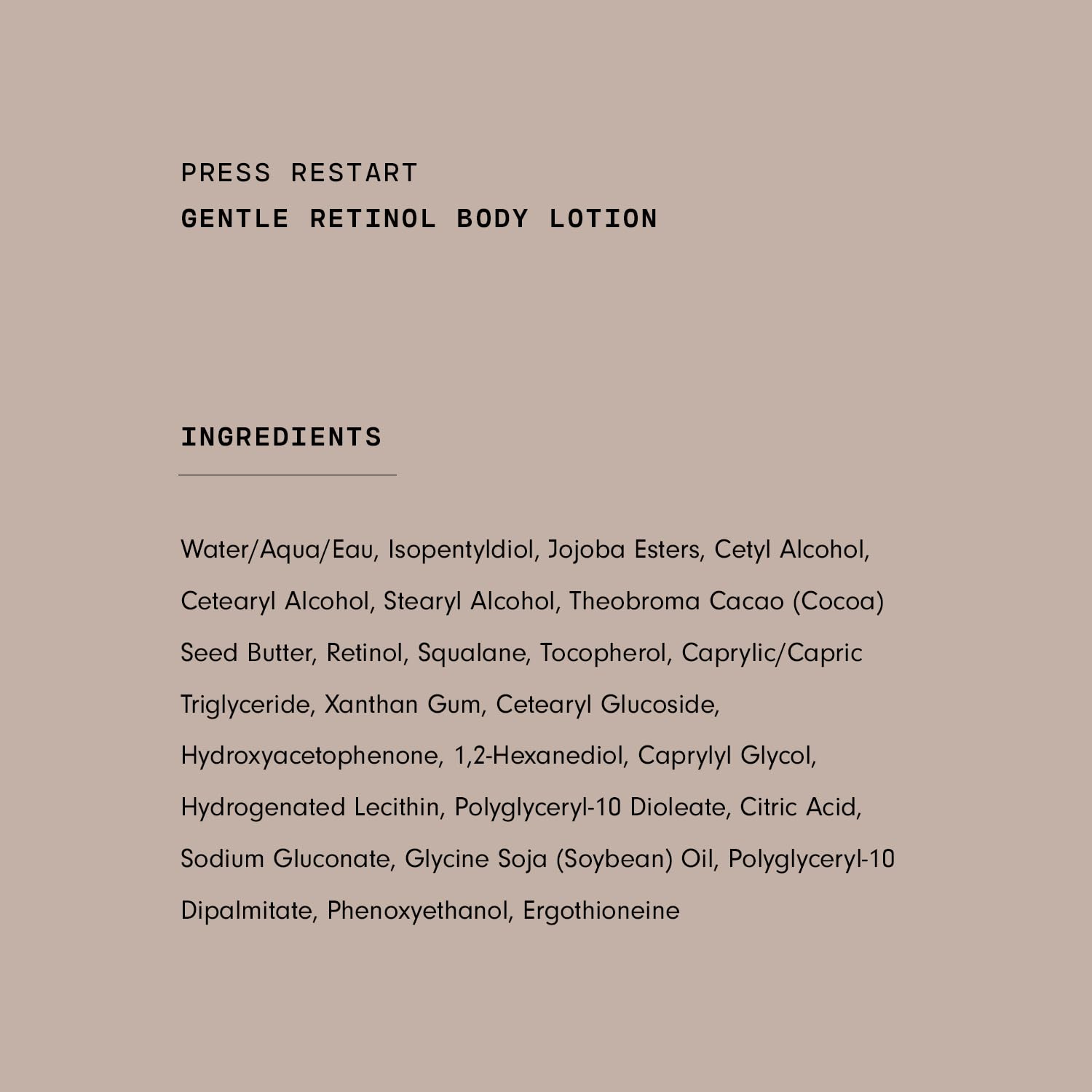 - Skin Firming Ingredients - The Press Restart firming lotion contains encapsulated retinol that gently renews aging skin, while the moisture-locking ingredients, like cocoa butter and squalane, relieve dryness and make this a must have body lotion for your daily skin care routine.